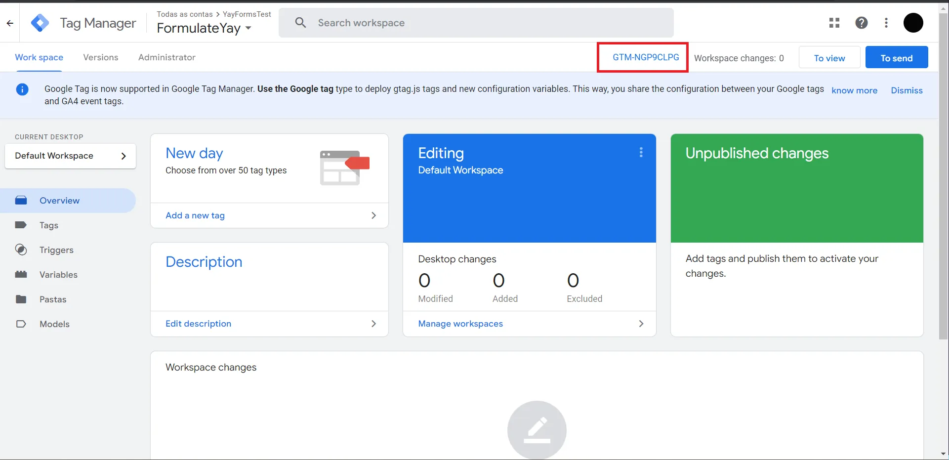 Você também pode localizá-lo na tela inicial do Google Tag Manager, como exemplificado abaixo.