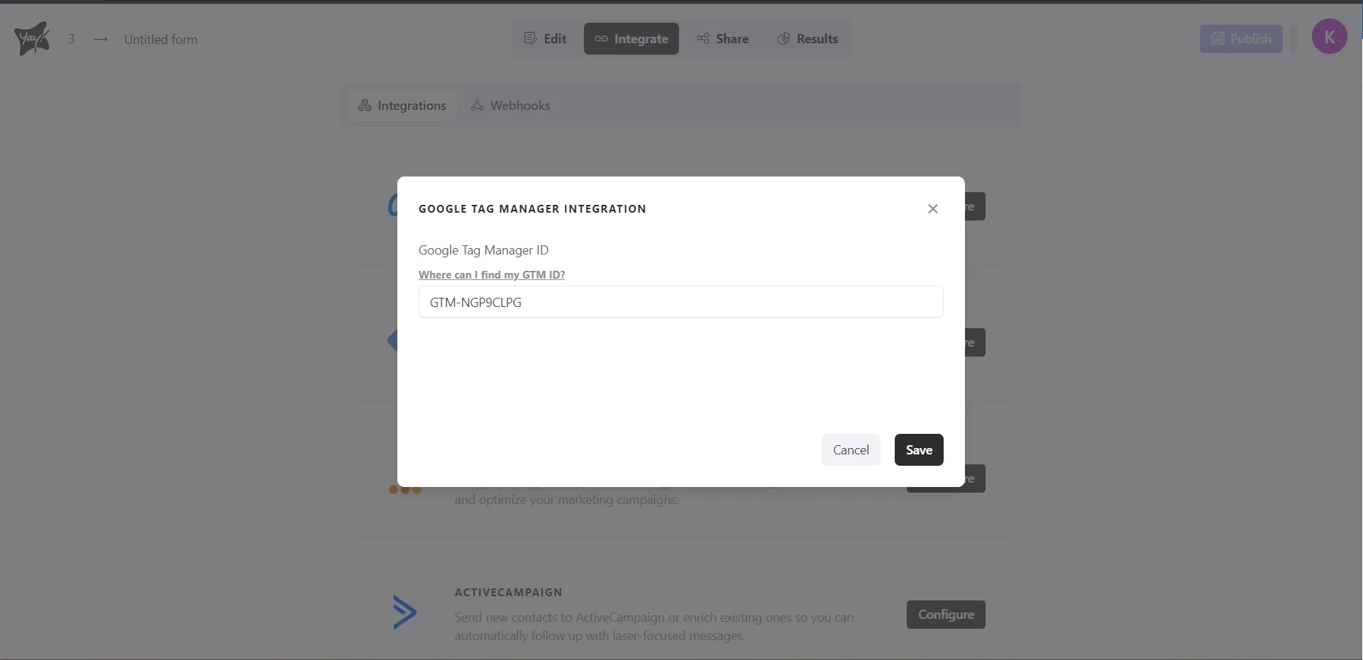 Inicialmente, acesse o formulário desejado e selecione a aba Integrar. Nesse momento, você encontrará a alternativa relativa ao Google tag manager. Clique em Configurar a fim de proceder com a sua integração.