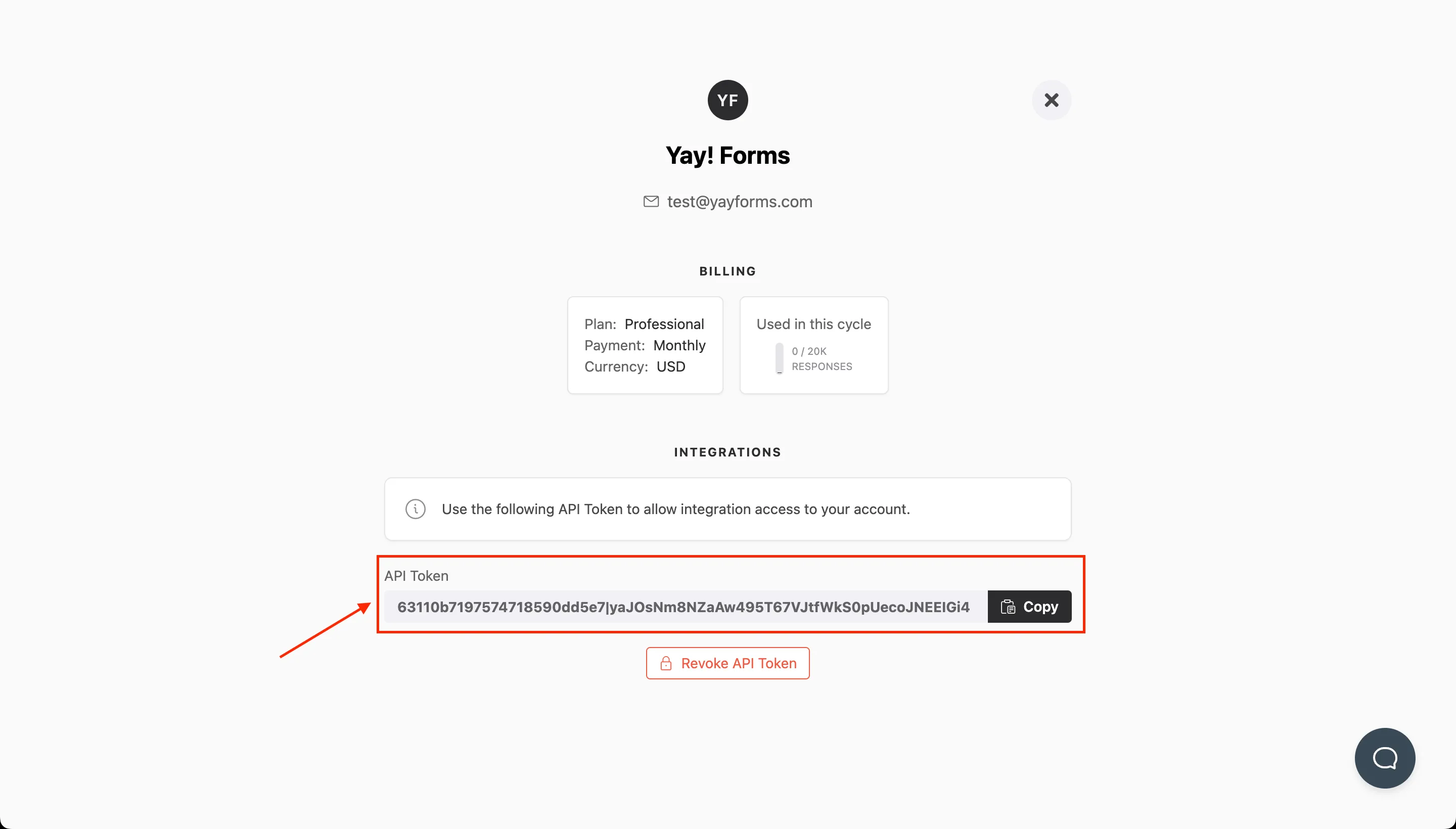 Você pode gerar/obter sua chave de token de API em https://app.yayforms.com/me, como indicado na imagem abaixo: