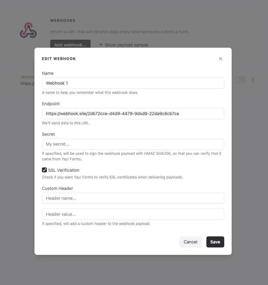 1. Secret para Assinatura de Payload: Agora você pode especificar uma “Secret” que será usada para assinar o payload do webhook com HMAC SHA256. Isso permite que você verifique se o payload veio de fato do Yay! Forms, garantindo a autenticidade dos dados recebidos.