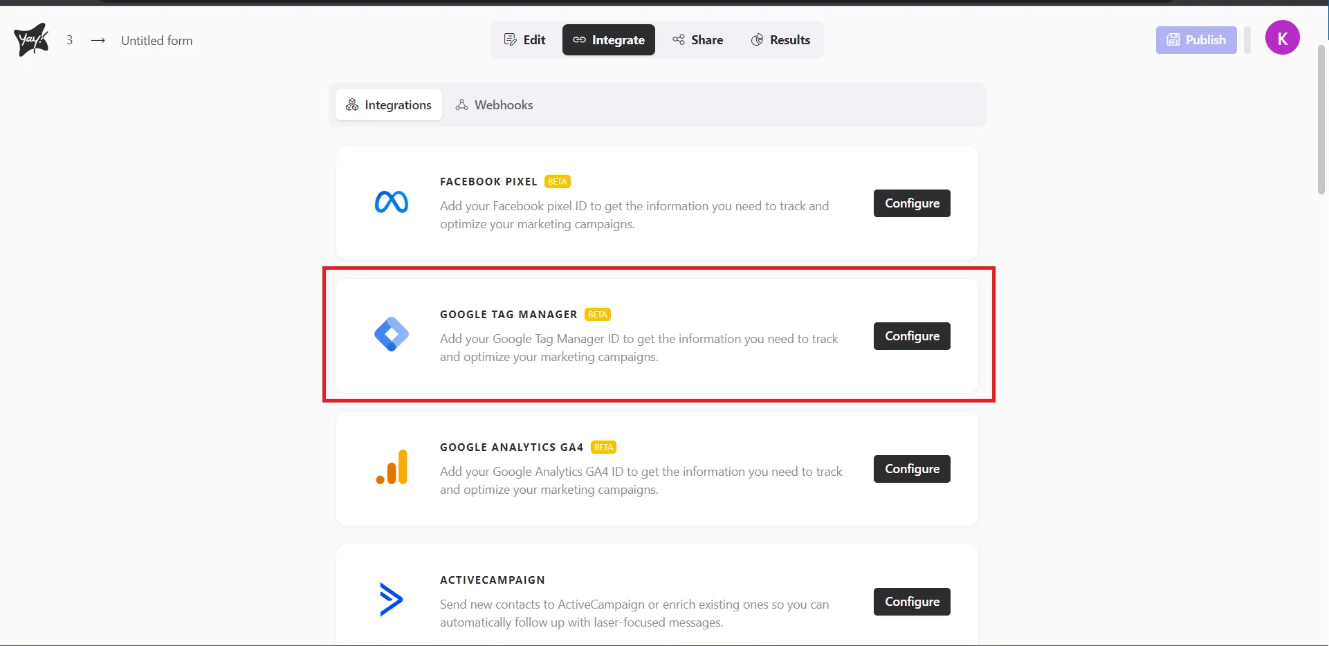 Inicialmente, acceda al formulario deseado y seleccione la pestaña Integrar. Aquí, encontrará la opción relacionada con Google Tag Manager. Haga clic en Configurar para proceder con su integración.