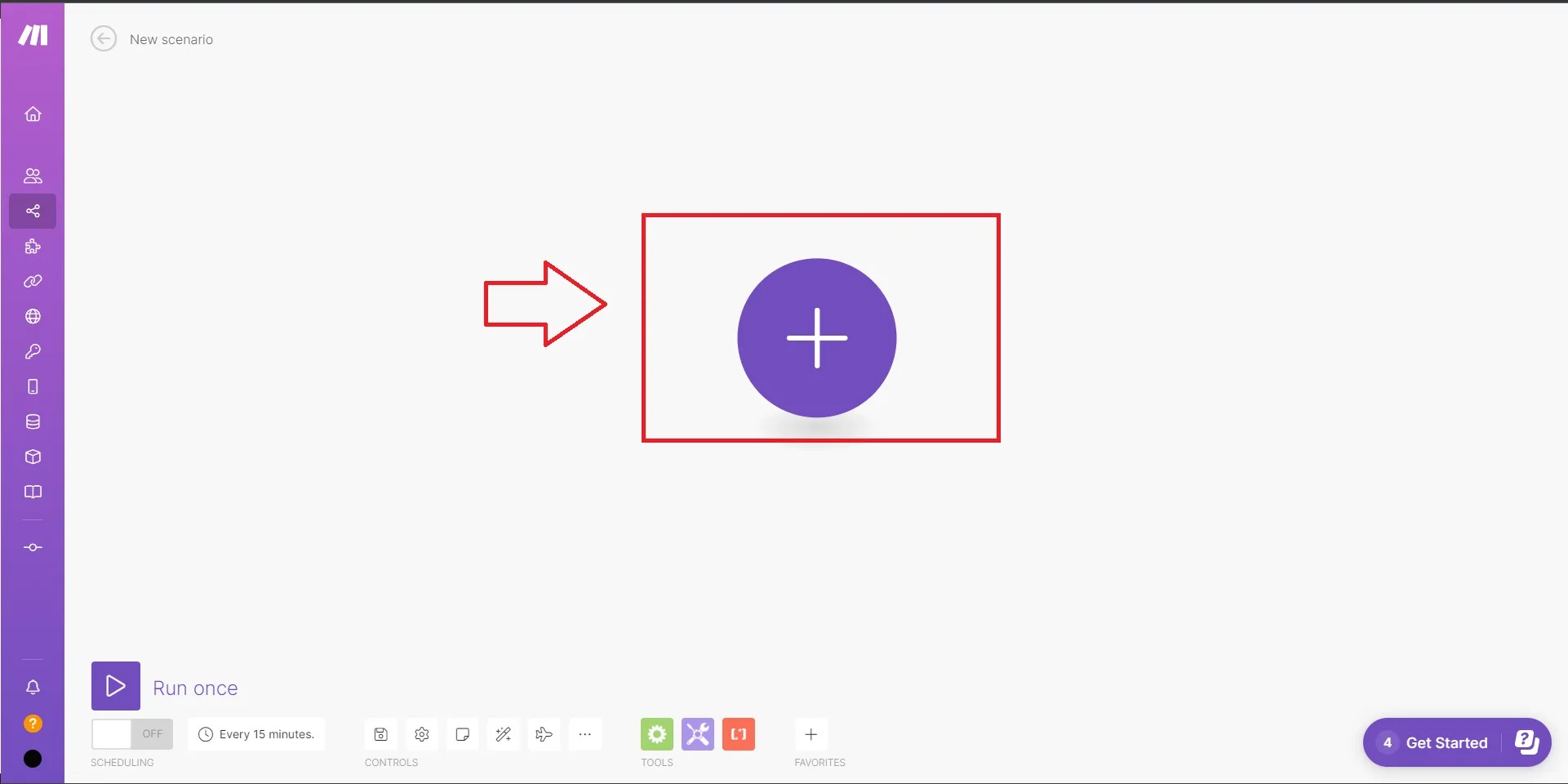 Inicie sesión en su cuenta de Make, haga clic en “Crear un nuevo escenario”. Después, haga clic en el icono en el medio de su pantalla.
